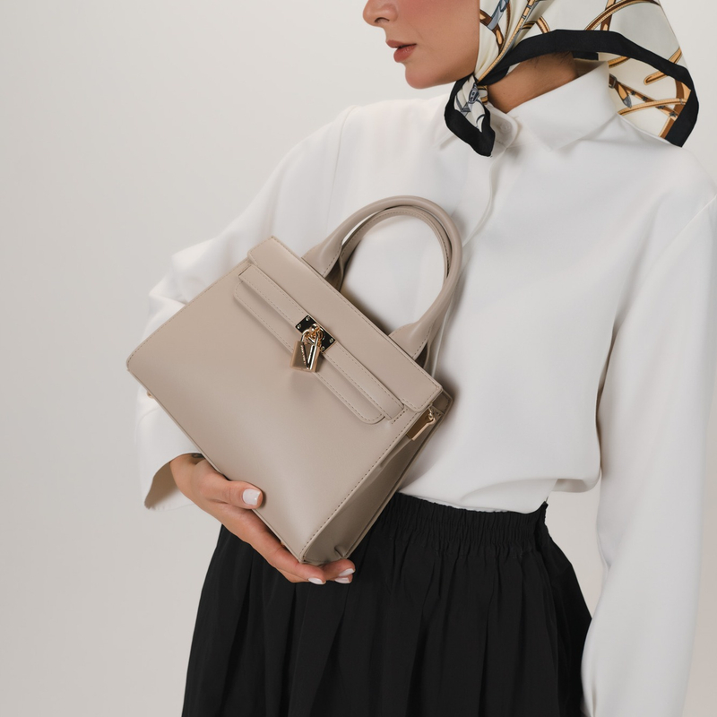 ابعاد : طول ۲۴ سانتیمتر، ارتفاع ۱۹ سانتیمتر، عرض ۱۰ سانتیمتر — ابعاد مناسب برای حمل وسایل ضروری روزانه مانند کیف پول، موبایل، دفترچه یادداشت و لوازم آرایشی.