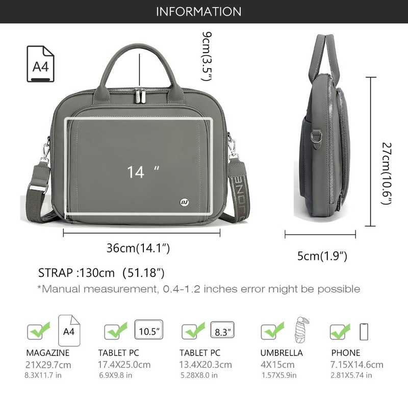 ابعاد تقریبی: ۳۶ × ۲۷ × ۵ سانتیمتر؛ فضای کافی برای حمل لپتاپ ، اسناد، کتاب و وسایل شخصی فراهم میکند.